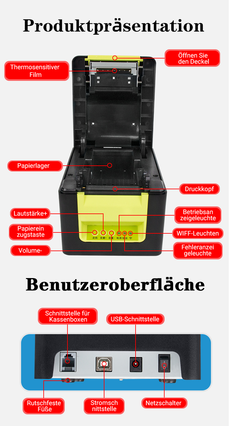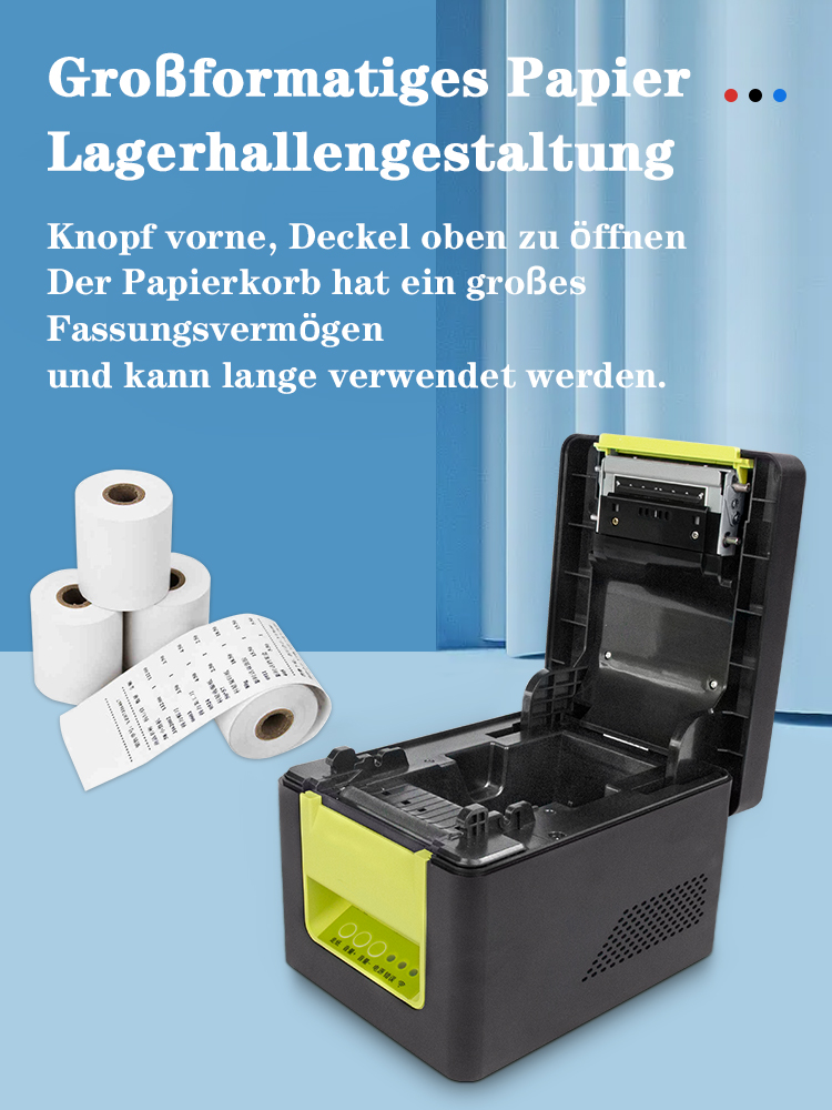 Dank der Unterstützung von Bluetooth, WLAN, 2G und USB ist dieser Bluetooth-Bondrucker mit nahezu allen Geräten kompatibel und ermöglicht die Ausgabe hochauflösender Belege, Etiketten, Papiertickets und mehr.